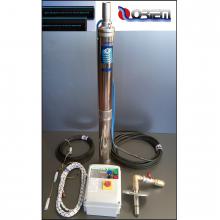 Impianto pozzo costituito da elettropompa sommersa 4” Pedrollo tipo 4SR 4/9 idonea per la pressurizzazione idrica per pozzi fino a 40 mt di profondità e con Ø min. interno 110mm, completa di motore in bagno d’olio kw 0,75, v.230 monofase, cavo elettrico in neoprene di alimentazione e giunzione vulcanizzata. Cavo sonde in neoprene completo di n.4 elettrodi inox per il controllo del livello di acqua nel pozzo, guaina corrugata guida sonde per il corretto funzionamento e manutenzione delle sonde, testa pozzo inox per il bloccaggio della pompa e chiusura del pozzo, corda nautica di sicurezza. Kit raccordi in ottone per collegamento tubazione PE a pompa, kit raccordi in ottone per uscita dal pozzo e collegamento a tubazione d’impianto. Tubazione in polietilene PE di spinta Dn 32 e quadro elettromeccanico di comando e protezione della pompa. (100% MADE IN ITALY)